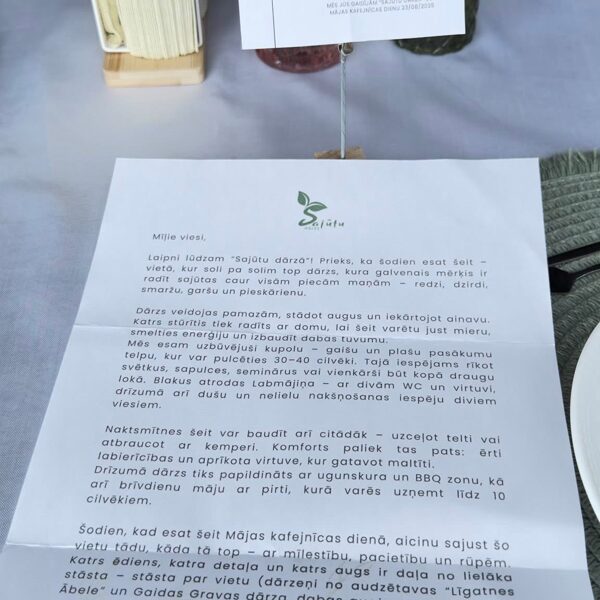 Tomēr sajūtas neradīs tikai ēdiens! Šeit jūs varēsiet atpūsties, baudīt gardus dzērienus un ļauties dārza burvībai. Būs ko darīt, ko redzēt, ko dzirdēt, ko sajust, ko smaržot un, protams, ko garšot! Dabisko sajūtu buķeti papildinās burvīgas ksilofona skaņas, radot mierpilnu un harmonisku atmosfēru.